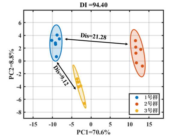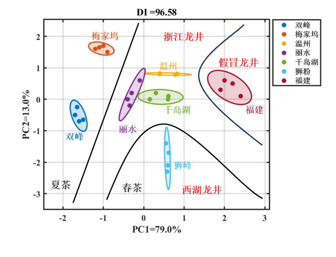 实验结果:分析结果显示,7个不同产区的龙井茶样品在主成分空间呈现显著分离(判别指数DI>15),其中核心产区(如狮峰、梅家坞)样品因独特的鲜爽味和醇厚度等风味特征形成明显聚类,而福建仿冒产品则独立分布于远端区域。电子舌不仅能区分产地,还能捕捉到春茶与夏茶的细微差异,说明季节因素对茶叶风味的影响同样能被有效识别。该技术为龙井茶产业提供了可靠的产地鉴别和品质管控解决方案,在维护核心产区权益、规范市场秩序、保障消费者权益等方面具有重要应用价值。