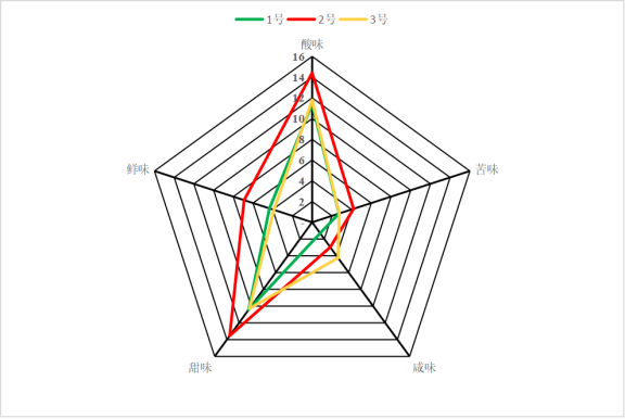 实验结果:基于PCA和欧氏距离的定量评估显示,1号与3号样品风味相似性较高(欧氏距离9.12),而与2号样品存在显著差异(欧氏距离21.28),说明3号配方样品与市售竞品滋味更为相似。进一步通过味觉强度分析发现,2号样品的酸味、苦味和鲜味强度均强于1号样品均,这种差异主要源于配方中呈味物质的配比不同。而3号配方样品与1号竞品的差异主要来源于咸味,在调整配方时,可减少咸味呈味物质的量。电子舌为产品配方优化提供了客观、量化的技术支撑,可有效指导企业缩短新品研发周期并提升产品适口性。